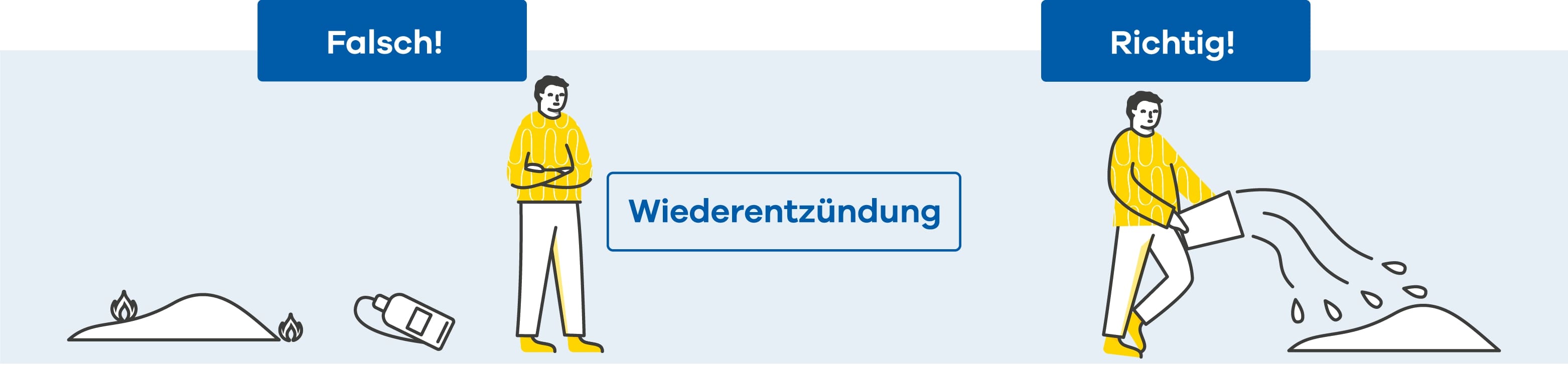 Vorsicht vor Wiederentzündung – Glutnester immer mit Wasser löschen. Nur so viel Löschmittel einsetzen, wie notwendig ist, um den Brand zu löschen (Reserve für eine etwaige Rückzündung).