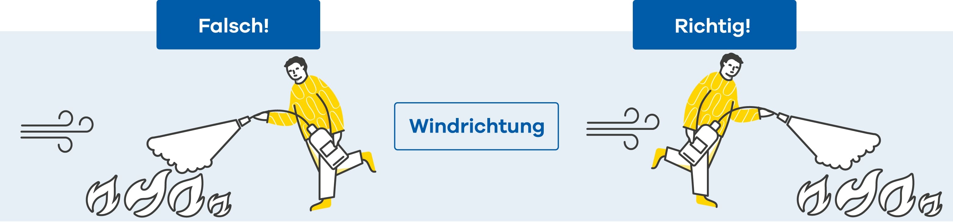 Den Löscher erst am Brandherd betätigen. Dabei senkrecht halten und darauf achten, das Feuer in Windrichtung zu bekämpfen.