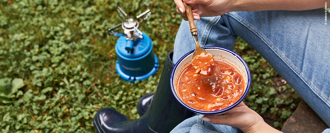 Gaskocher und Eintopfgericht im Grünen