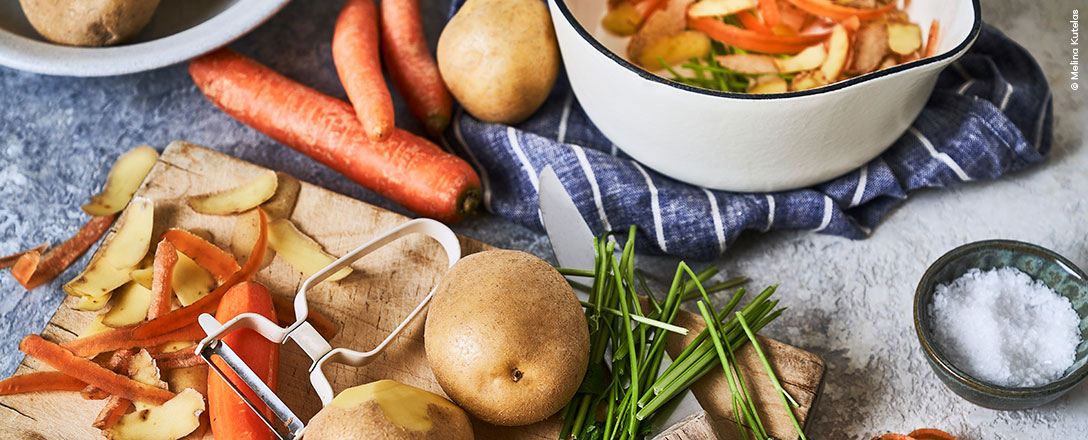Was und wieviel man verwenden kann, hängt natürlich auch davon ab, wie gut man ein Lebensmittel kennt: „Für mich fängt alles damit an, mir bewusst zu machen, was es in meinem Lebensraum zu welcher Jahreszeit gibt – und wo ich es in der entsprechenden Qualität besorgen kann“, erklärt Müller. Denn bei der Sellerie, dem Kohl oder der Karotte vom Bauernmarkt der Region ergibt sich eine andere Verwertungssicherheit als bei der Banane aus dem Flugzeug. Da kann man Schalen, Strunke oder dranhängendes Grünzeug in der Regel bedenkenlos verwenden, um in der Küche zu zaubern.