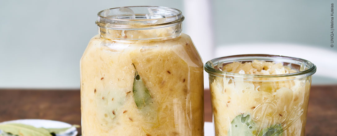 Altes Wissen ist auch die Technik des Fermentierens. Genauer gesagt, ist es neben der Alkoholgärung die älteste Form der Konservierung. Als die Menschen sesshaft wurden, entdeckten sie als erstes die milchsaure und alkoholische Gärung. Beim Einlegen von Gemüse hemmt Salz das Wachstum von Keimen. Bis zu einem gewissen Grad vertragen Milchsäurebakterien das Salz gut. Außerdem bleiben Vitamine, Mineralstoffe erhalten und Enzyme bilden sich dabei. Das bedeutet: Fermentieren verändert die Haltbarkeitsdauer, den Geschmack und die Konsistenz eines Lebensmittels. Darüber hinaus sorgen die Milchsäurebakterien für den gesundheitlichen Zusatznutzen.