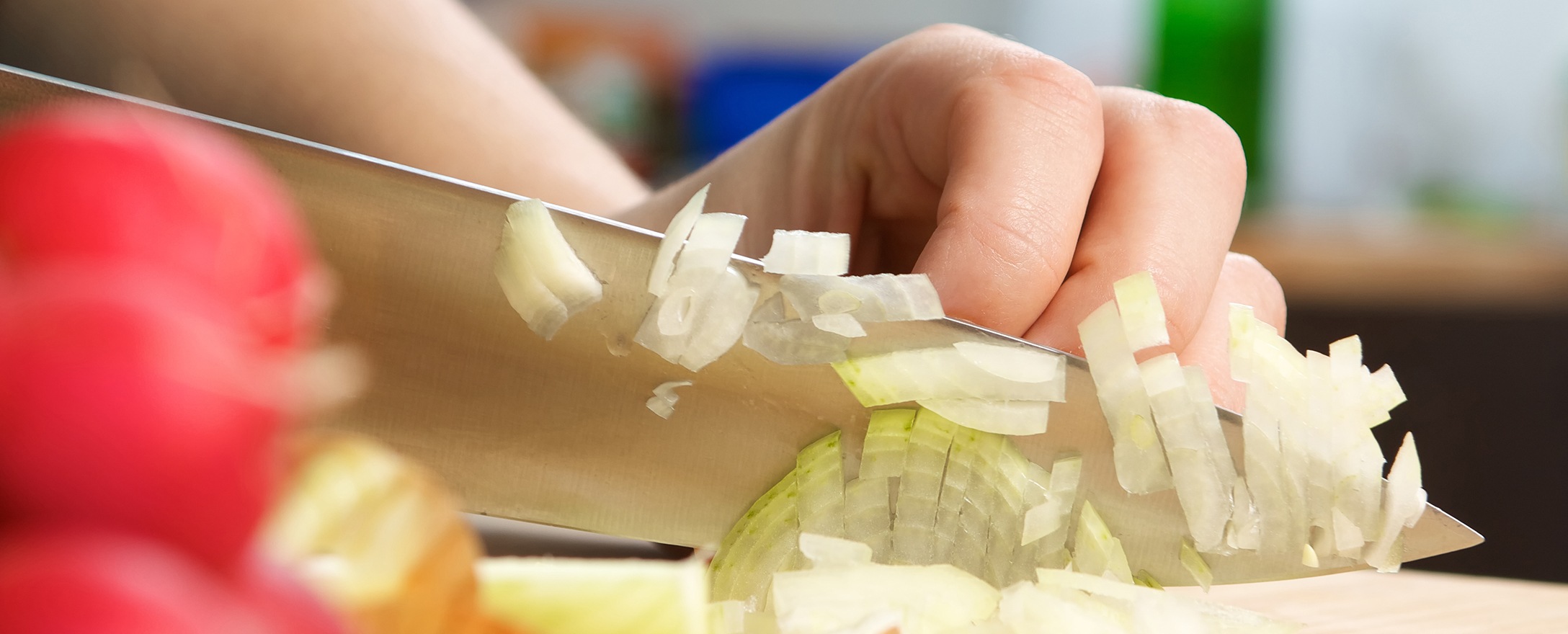 Beim Schneiden treffen die zwei Stoffe Alliin und Alliinase aufeinander, und es kommt zur Bildung eines Reizgases, das die Zwiebel vor Schädlingen schützt. Gelangt dieses Gas in unsere Augen, beginnen sie zu tränen. Tipp: Geschälte Zwiebel in kaltes Wasser tauchen, halbierte Zwiebel mit der Schnittfläche nach unten aufs Schneidebrett legen und ein scharfes Messer verwenden.