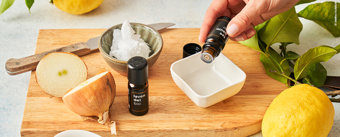 Insekten werden über Gerüche angelockt oder vertrieben. Das können wir uns zu Nutze machen: Gelsen mögen keine Zitrusgerüche, auch Lavendel-, Pfefferminz- oder Teebaumöl kann Insekten den Tag vermiesen. Verdünnt (z.B. mit einem reinem Pflanzenöl, wie Mandelöl) können wir diese ätherischen Öle direkt auf die Haut auftragen oder ein paar Tropfen in eine Duftlampe geben.