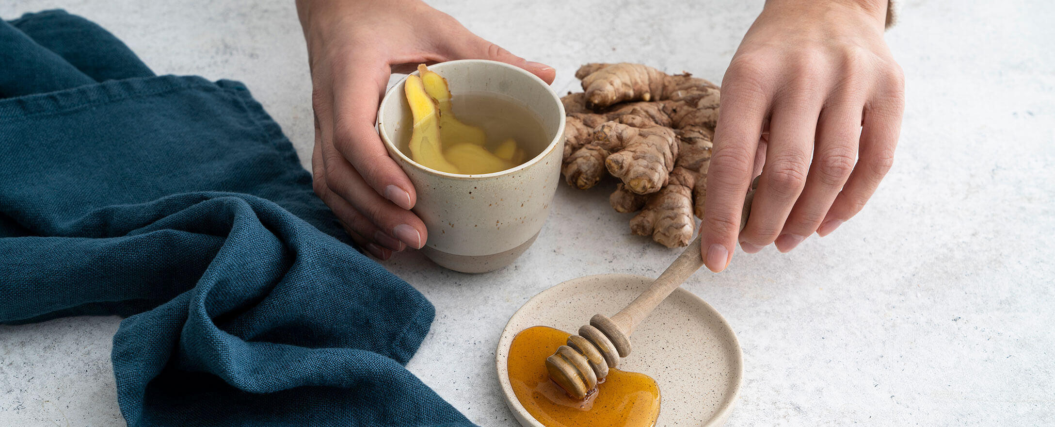 Drei Stück frischer Ingwer (jedes etwa so groß wie eine Knoblauchzehe) schälen, in Scheiben schneiden und mit ½ Liter Wasser etwa 20 Minuten lang köcheln – fertig ist der Ingwertee! Danach warm trinken. Wer einen empfindlichen Magen hat oder zu trockener Haut neigt, kann einen Teelöffel Honig dazu geben.