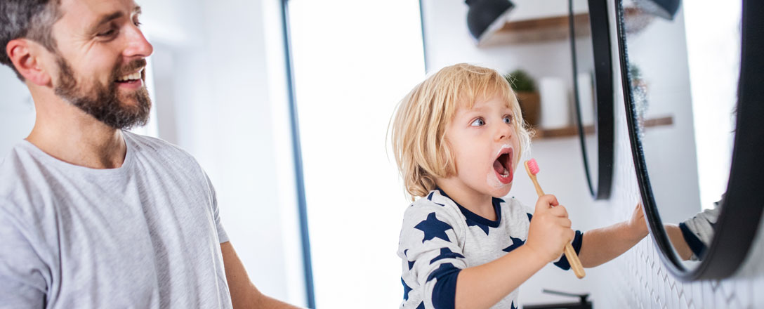 Kinder brauchen einen spielerischen, angenehmen Zugang zur Zahnhygiene, also darf das Zähneputzen getrost mit Musikbegleitung oder gemeinsam mit Geschwistern oder Stofftieren stattfinden. Wichtig ist, die Kinder Schritt für Schritt an die richtige Reinigung heranzuführen und sie dabei lange, etwa bis zum 9. Lebensjahr, zu begleiten. Zum Zahnarzt sollte man allerspätestens ab dem ersten Zahn gehen.