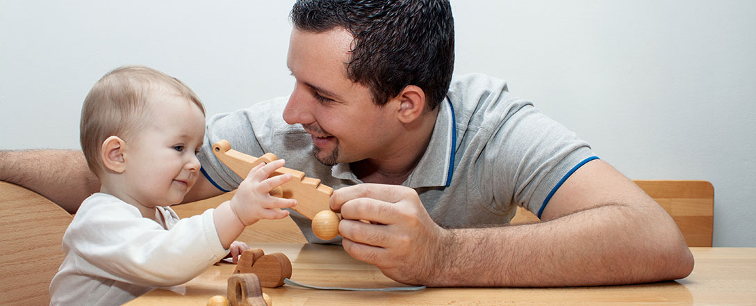 Vater spielt mit Kind am Tisch mit Holzspielzeug