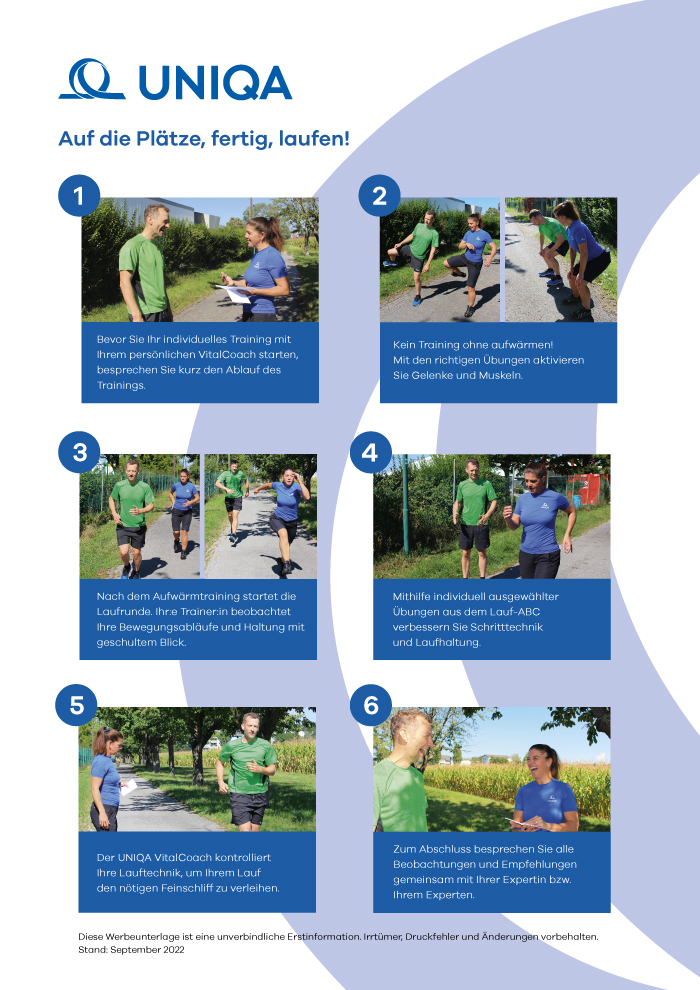Mit dem LaufCheck optimieren Sie Ihren eigenen Laufstil und bekommen individuelle Übungen und Tipps. Dabei achtet Ihr VitalCoach Unsere UNIQA VitalCoaches sind ausgebildete Gesundheitsexperten, die Sie persönlich beraten und zu einem gesunden und aktiven Lebensstil motivieren. Vor 20 Jahren startete UNIQA das VitalCoach Netzwerk in Wien. Die Nachfrage war so groß, dass das Angebot bald auf Österreich ausgerollt wurde. Seither sind es rund 100 VitalCoaches, die mit viel Engagement Kunden flächendeckend in ganz Österreich betreuen und beraten. Unsere langjährige Erfahrung nutzen wir für unsere Kunden in der Prävention und die ständige Weiterentwicklung neuer Angebote. auf den nötigen Abstand.
