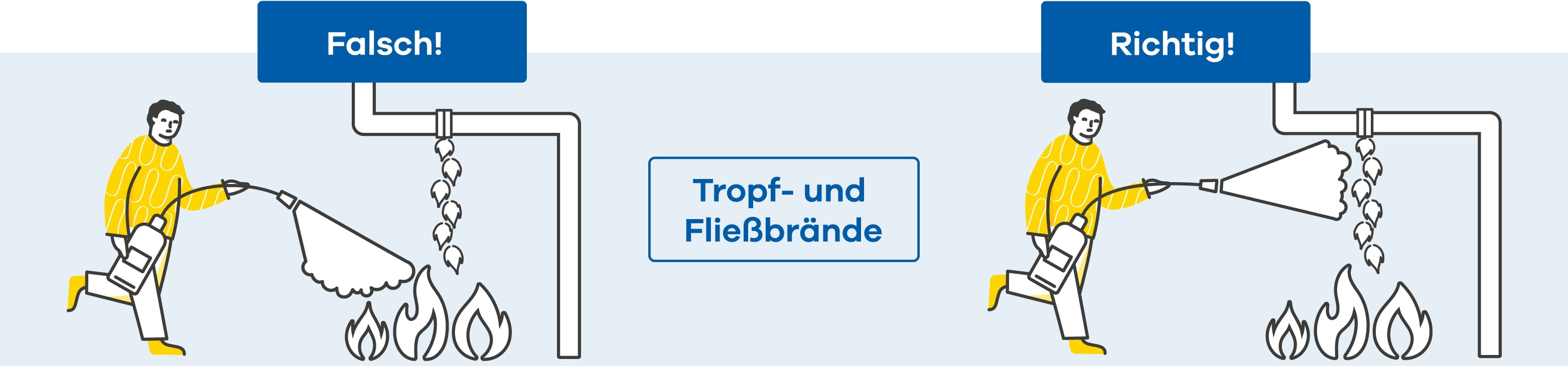 Bei Tropf- und Fließbränden von oben nach unten löschen.